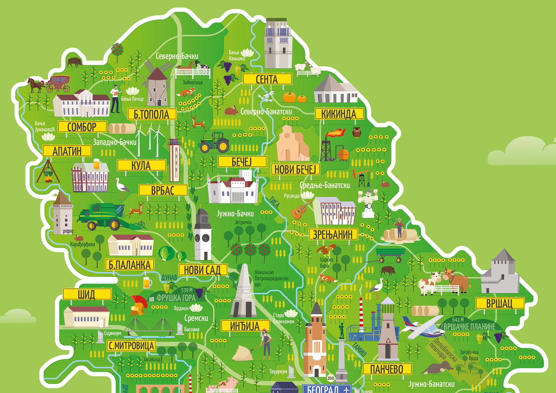 The Vojvodina Province map is a crucial component of a larger Serbia map that I have personally created. The map is rich with detailed information, including specific landmarks located near each city, as well as unique rural species and cultural traditions. The goal was to create a comprehensive and informative map that provides a deep understanding of the Vojvodina Province.