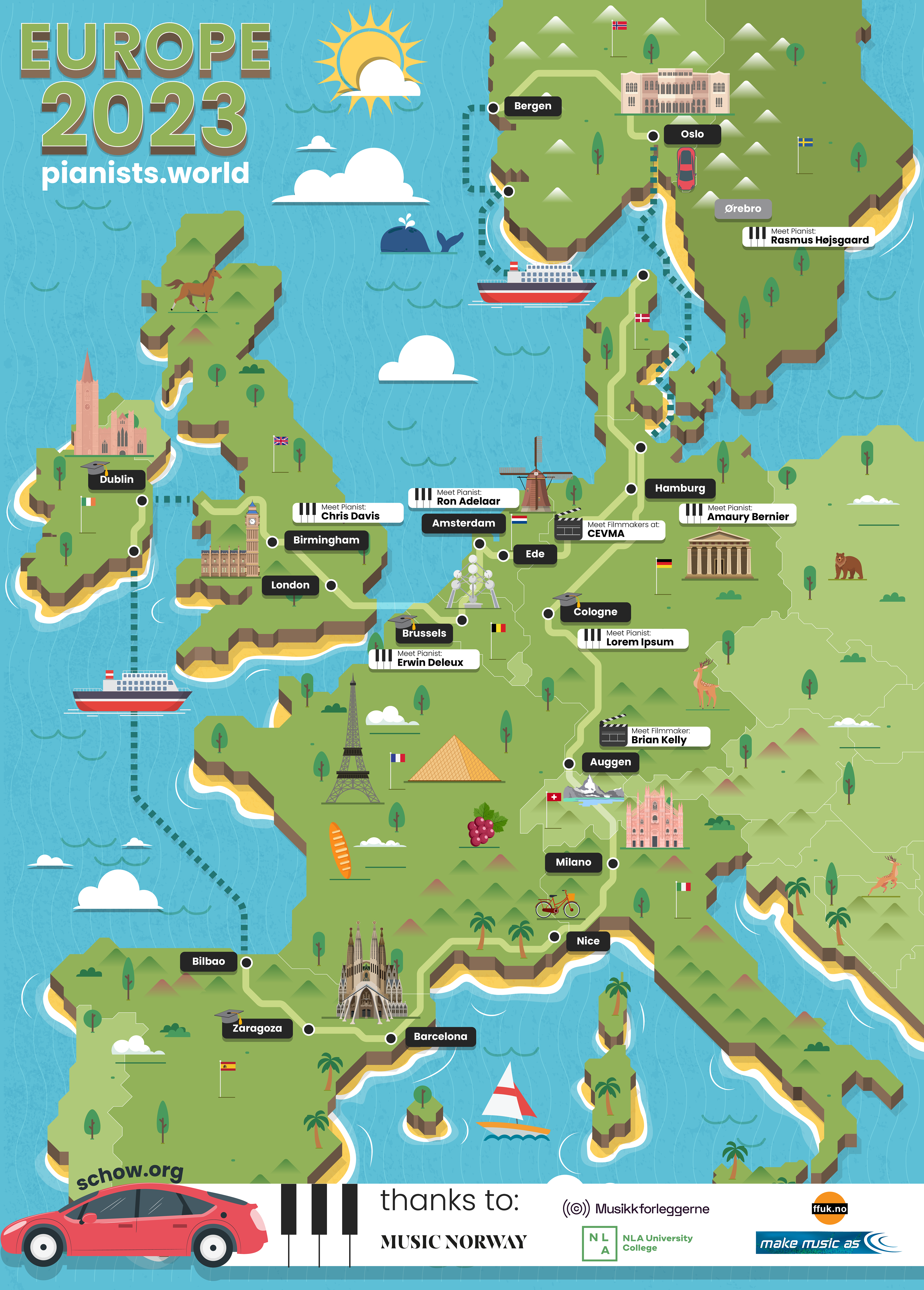 This map was created for a client from Norway who embarked on a tour of Europe with his Tesla Model 3, visiting pianists.
