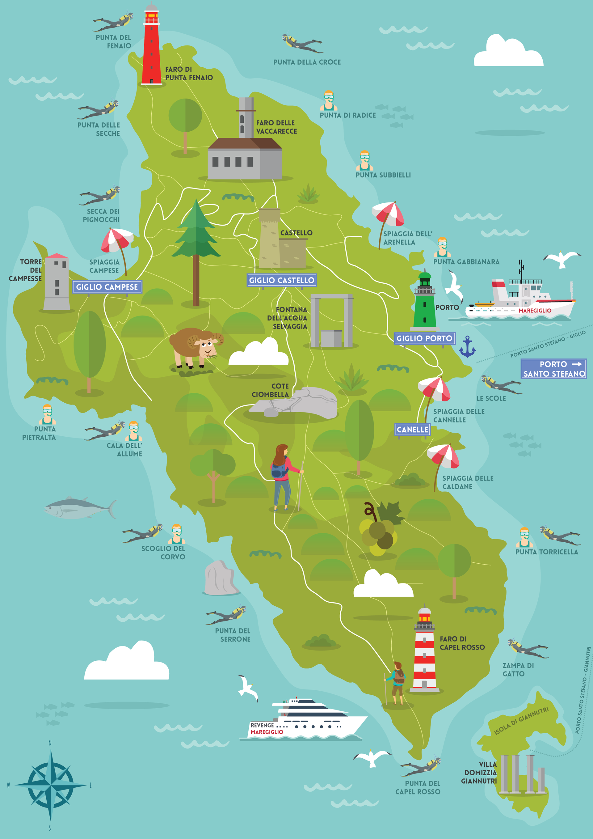 The client, Giglio Island, a small island in Italy, required a vector map to showcase the island's boat routes and the surrounding islands and east coast of Italy. The map was created with the goal of highlighting the island's beauty through illustrations and showcasing the available boat tour options. The final product is a visually appealing representation of the island's unique features.