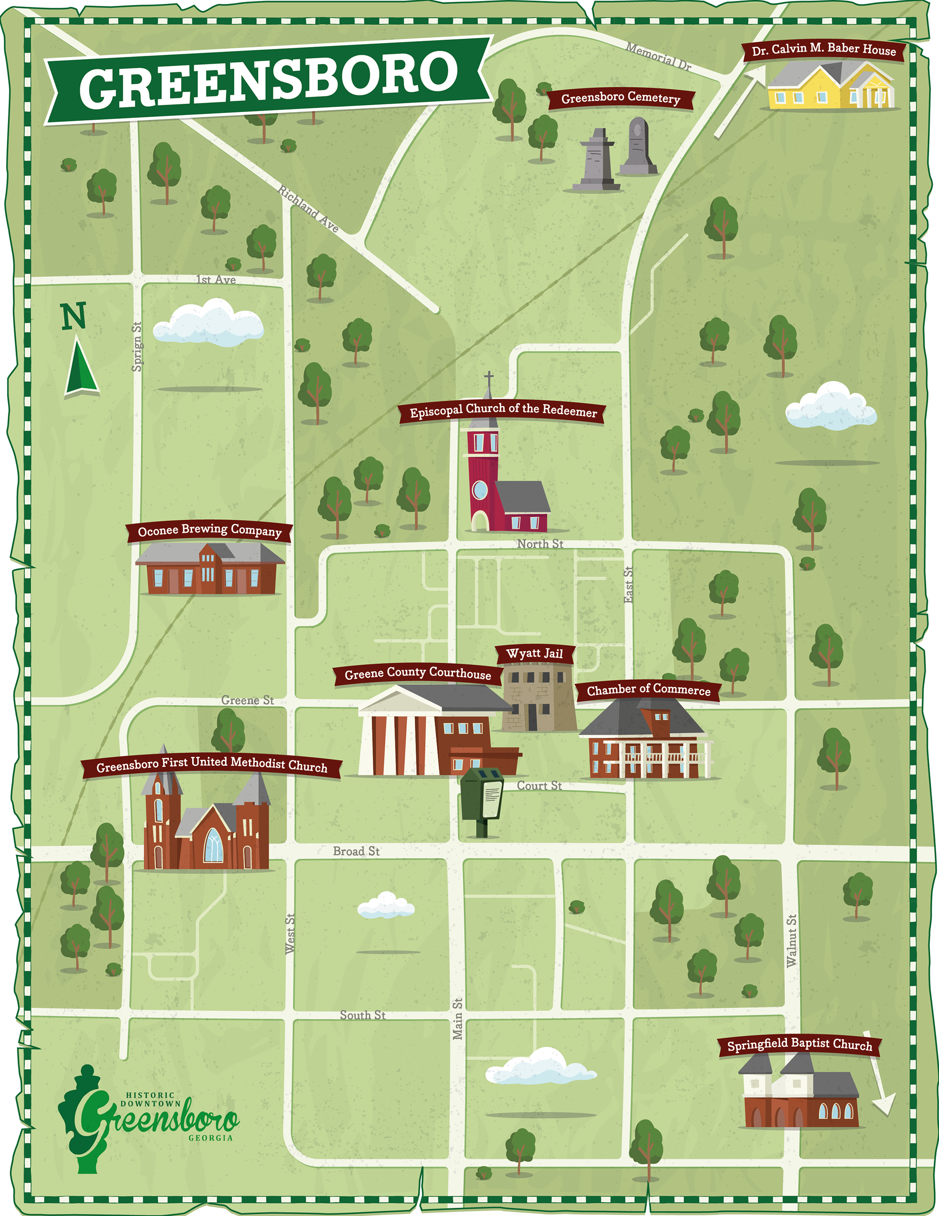 This map was created for Historic Downtown in Greensboro, GA. The goal was to present the 9 most significant sites in this part of the city that are within the pedestrian route of the tourist organization.