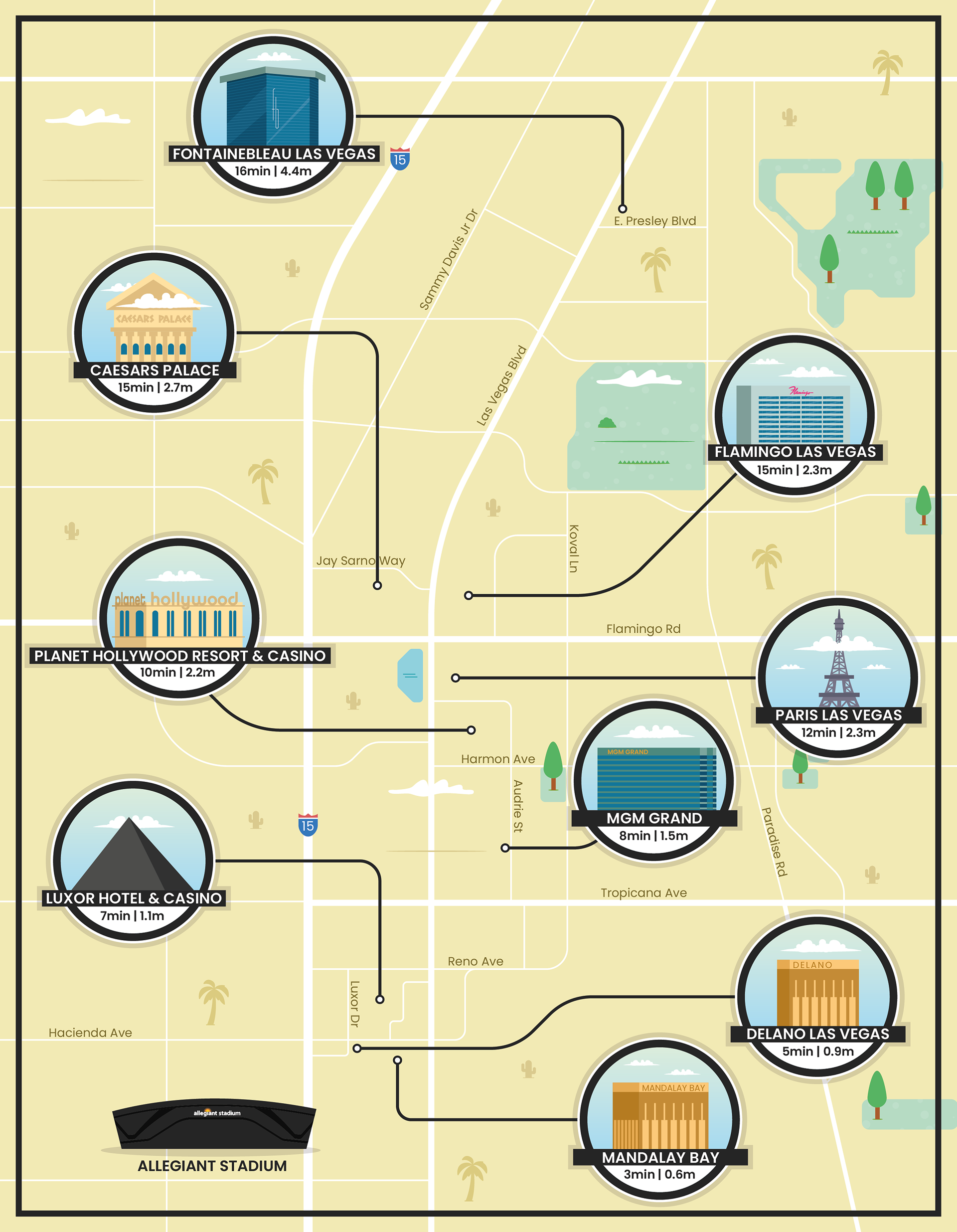 This map was made for a client, a marketing agency, for the upcoming festival in Las Vegas. The aim of the map was to show some of the largest and most significant hotels, namely their distances in relation to the stadium - the venue where the concert will take place.